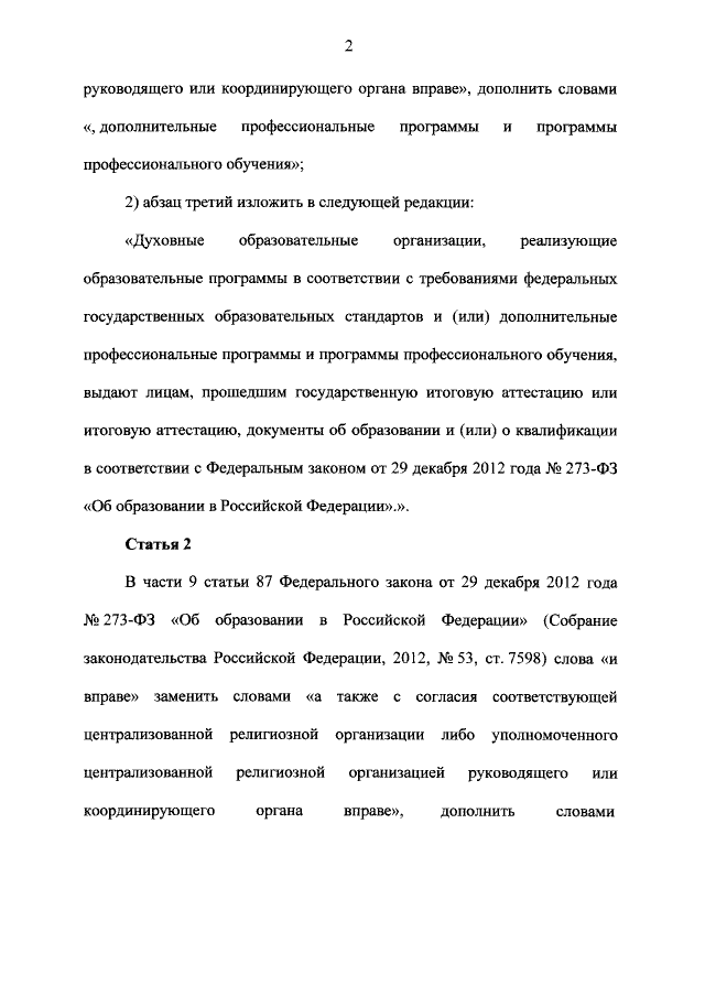 Также определяется, что духовные образовательные организации, реализующие образовательные программы в соответствии с требованиями федеральных государственных образовательных стандартов (ФГОС) и дополнительные профессиональные программы и программы профессионального обучения, выдают лицам, прошедшим государственную итоговую аттестацию или итоговую аттестацию, документы об образовании и о квалификации в соответствии с ФЗ "Об образовании в Российской Федерации".