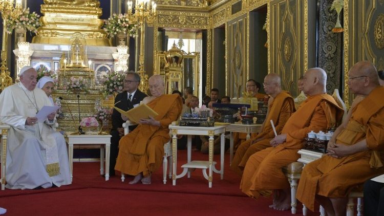 Папа Франциск обратился к Верховному патриарху таиландских буддистов Сомдету Пхра Ариявонгсагатанане. Встреча состоялась в ходе апостольского визита Папы в Бангкок в храме Ратчабофит, «символе ценностей и учений, которые характеризуют этот возлюбленный народ», - сказал Папа, отметив, что из источников буддизма его таиландские последователи почерпнули «обычай почитать жизнь и почитать стариков, сдержанный образ жизни, основанный на созерцании, отрешенности, тяжелом труде и дисциплине». Эти особенности – добавил Папа – «питают вашу отличительную черту, благодаря которой вас называют народом улыбки».