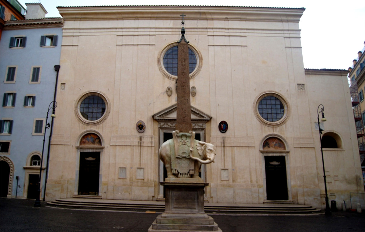 Базилика и площадь перед ней, на которой находится знаменитая скульптура слона с египетским обелиском (спроектированная Джан Лоренцо Бернини), обязаны своим названием античному храму Минервы, построенному в I веке нашей эры на Марсовом поле императором Домицианом. Согласно древней традиции, впоследствии эта территория была подарена Папой Захарием монахиням-василианкам, прибывшим в Рим из Константинополя. Сёстры построили здесь первую небольшую церковь, названную Санта-Мария-ин-Минервиум. В XIII веке опеку над храмом наследовали отцы-доминиканцы: именно в это время началось строительство нынешнего здания с характерной готической планировкой, уникальной для Вечного города.