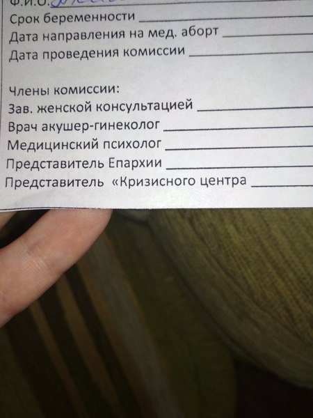 В соцсетях появилась фотография бланка для жительниц Белгородской области, которые собираются делать аборт. Пользователь из Старого Оскола написал, что такой документ выдали его знакомой. Женщине, которая хочет прервать беременность, нужно собрать подписи членов комиссии. В нее входят акушер-гинеколог, зав.консультацией, психолог, а также представитель епархии РПЦ и кризисный центр, который, по данным СМИ, тоже курирует Русская православная церковь.