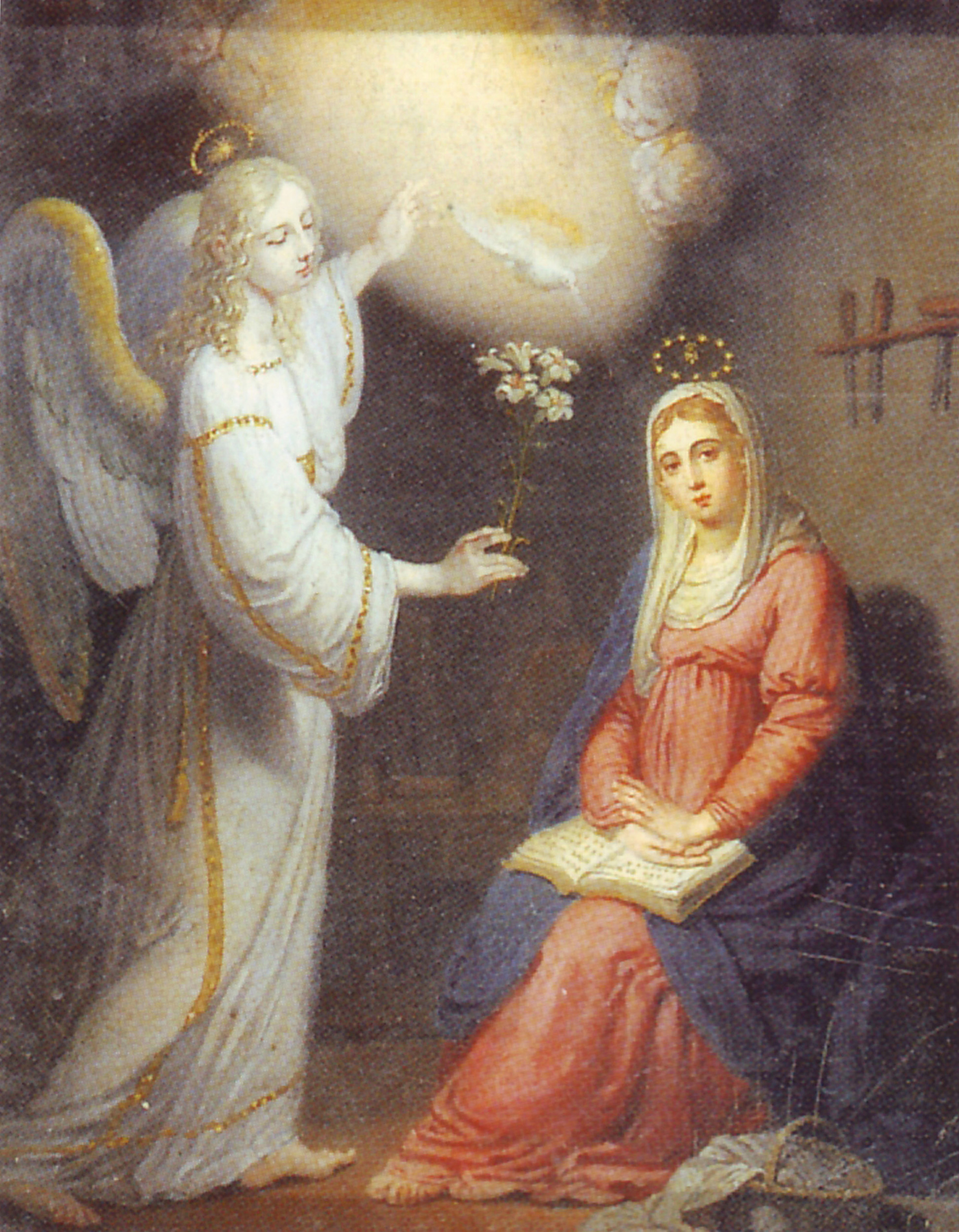 "Ангел, войдя к Ней, сказал: радуйся, Благодатная! Господь с Тобою; благословенна Ты между жёнами. Она же, увидев его, смутилась от слов его и размышляла, что бы это было за приветствие. И сказал Ей Ангел: не бойся, Мария, ибо Ты обрела благодать у Бога; и вот, зачнёшь во чреве, и родишь Сына, и наречёшь Ему имя: Иисус. Он будет велик и наречётся Сыном Всевышнего, и даст Ему Господь Бог престол Давида, отца Его; и будет царствовать над домом Иакова во веки, и Царству Его не будет конца."(Лк 1.28-33)